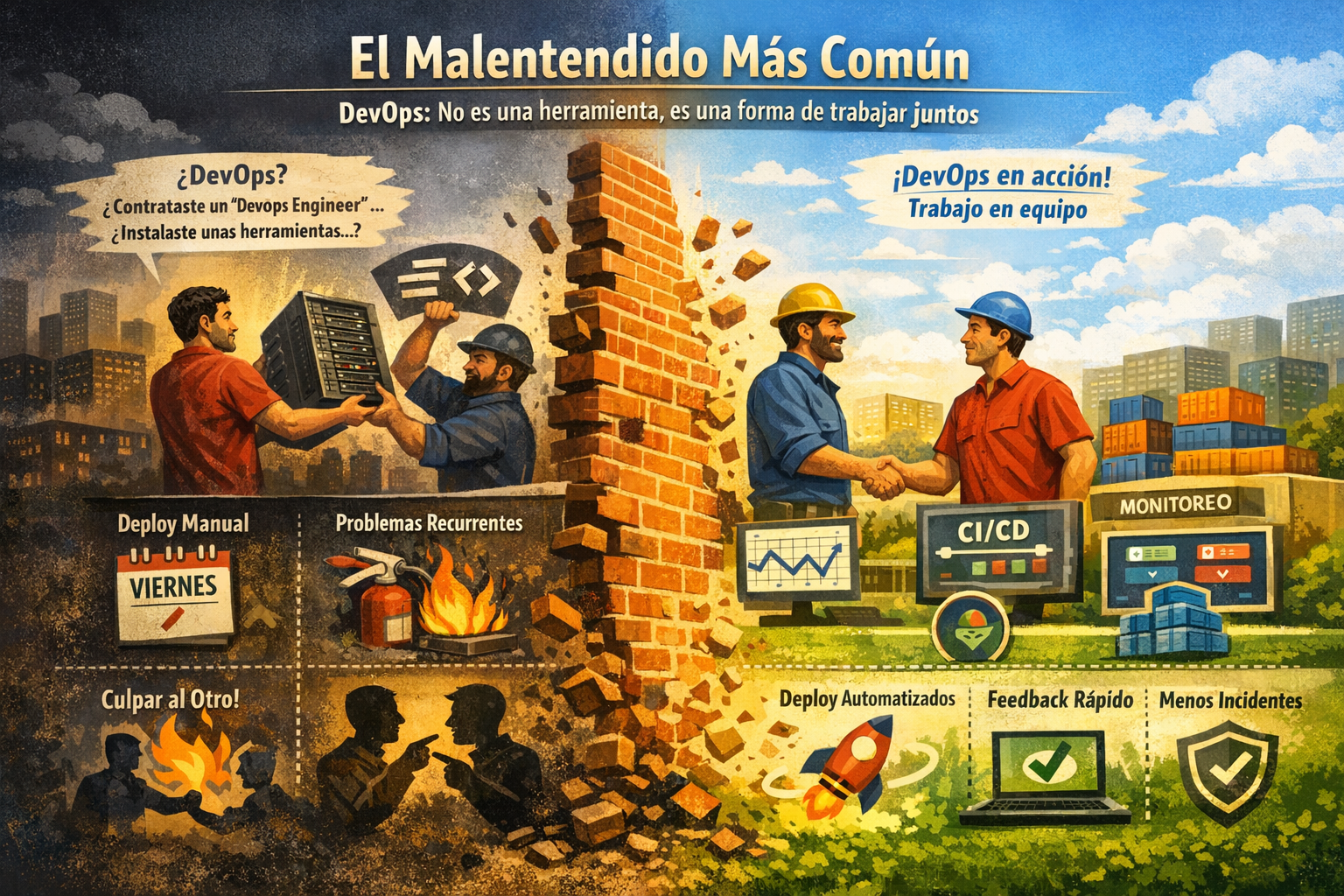 Lo he visto muchas veces: la empresa contrata a alguien con el título "DevOps Engineer", compra licencias de Jenkins o GitLab CI, y seis meses después todo sigue igual. Los deploys siguen siendo manuales los viernes por la tarde, los incidentes se apagan en lugar de prevenirse, y el equipo de desarrollo sigue culpando a infraestructura y viceversa.